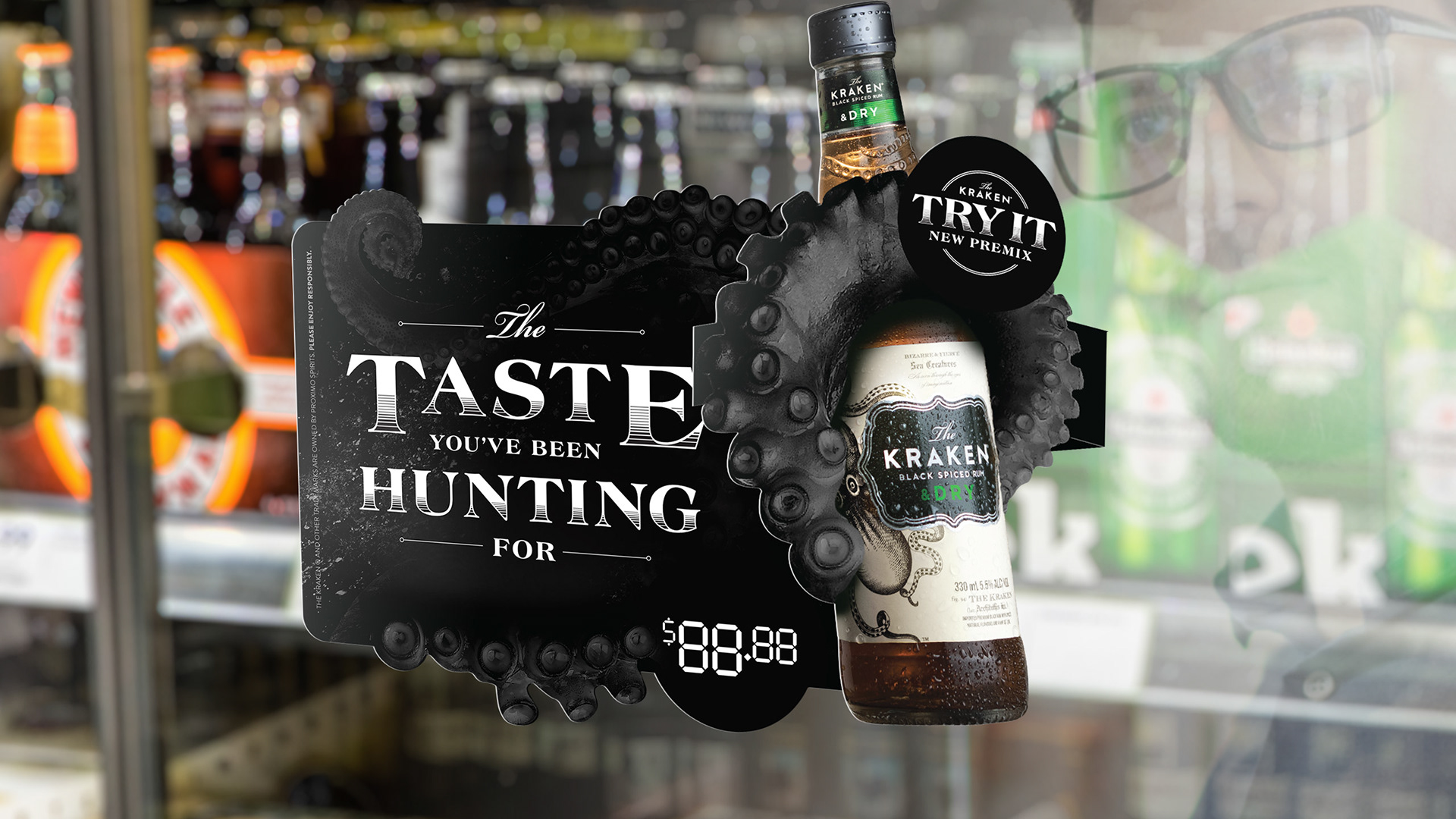 Traditionally sold as a classic spiced rum, The Kraken has now grown into the premix territory with two popular flavour mixes. It was my task to explore the in-store path to purchase, creating point-of-sale pieces that communicated with the shopper at each point in their journey from entry to fridge.